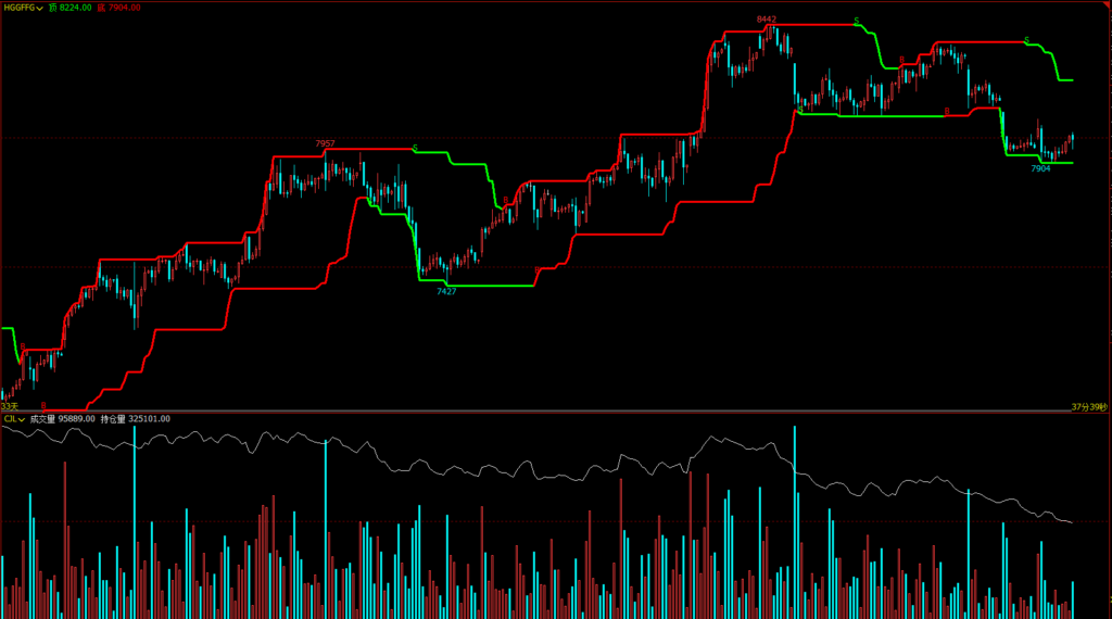 • CROSS(跟<踪,0.5):当底线的颜色由绿转红时,在底线附近标记“B”。(此信号表示下跌动能增强,但常作为警示或用于确认下降趋势,需谨慎使用,或可理解为“空方力量加强”的信号)。