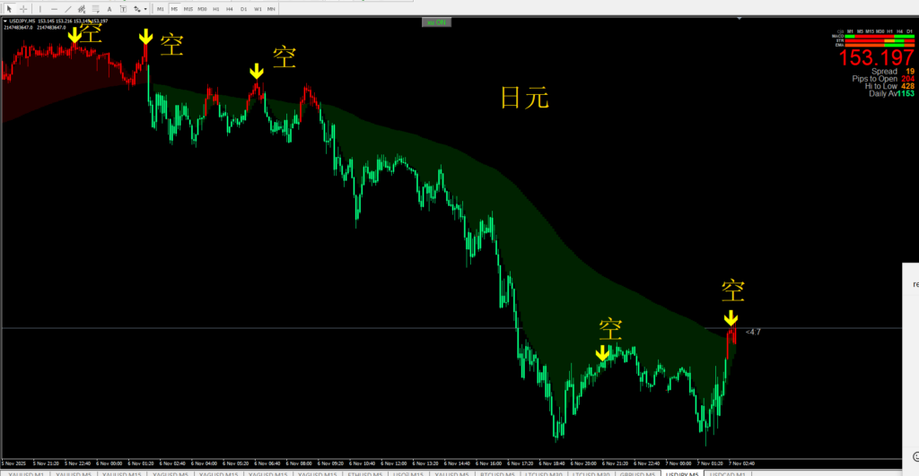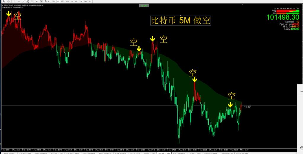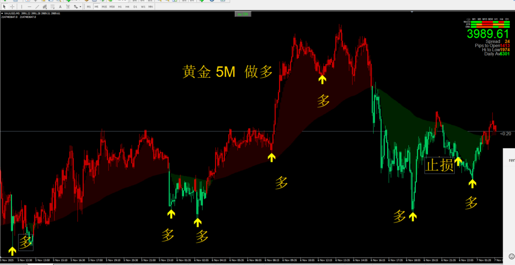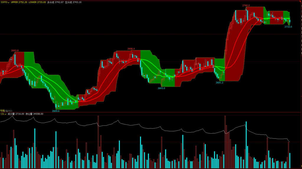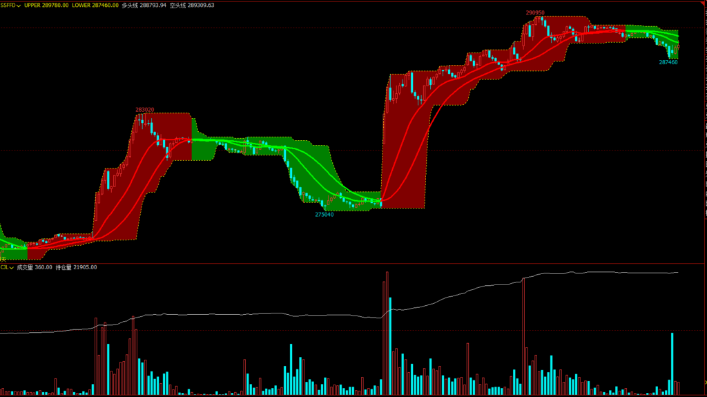 UPPER和LOWER),是未来突破的参照边界。 - 动量背景:红/绿填充色明确了当前应采取突破顺势交易的方向偏好。