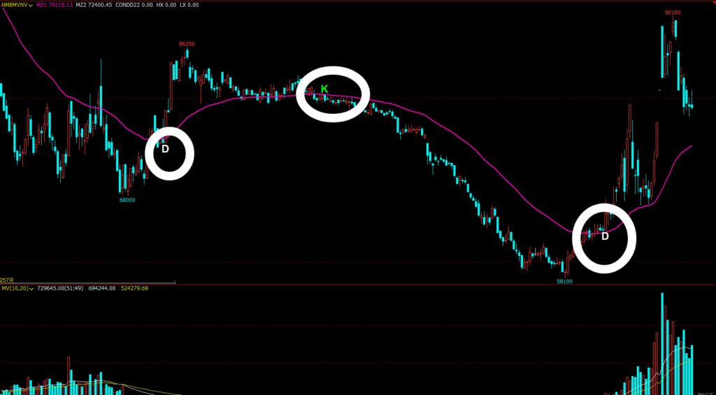 规则很简单:价格在MZ1之上,且MZ1在MZ2之上,则为多头格局,只考虑做多。反之,则为空头格局,只考虑做空。这首先从战略上保证了我们 “顺大势” ,不做逆势的炮灰。