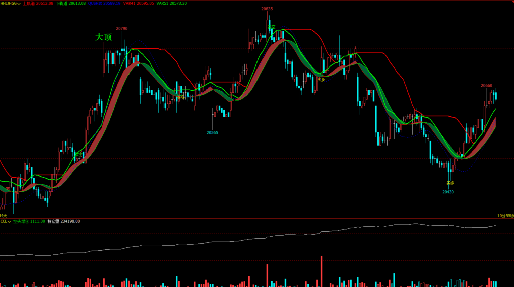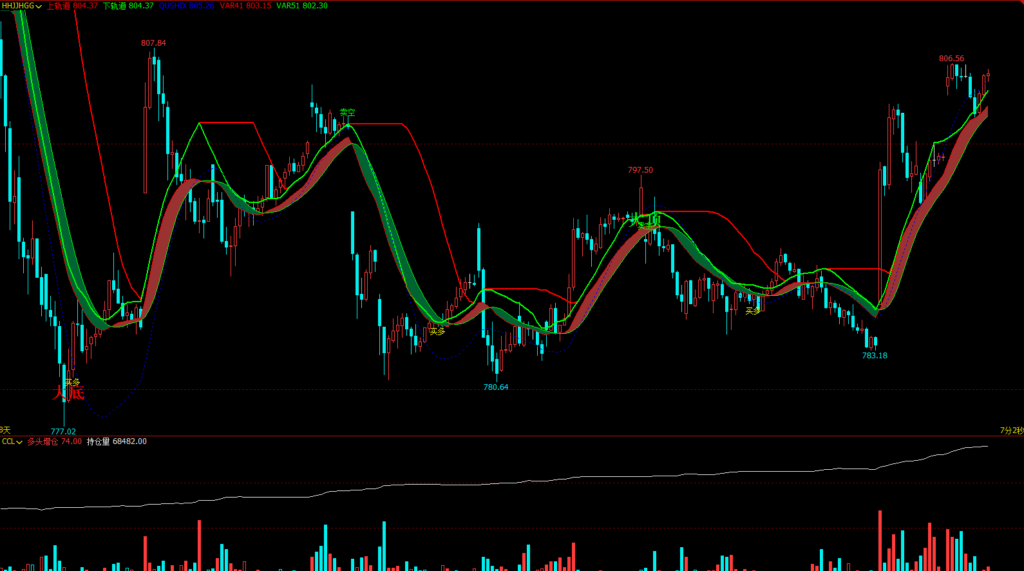 • 下轨道LLV(MA(H,13),1) —— 绿色支撑带,跌破即转弱信号