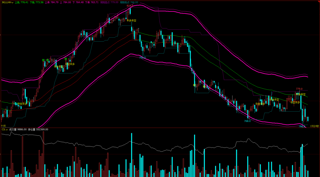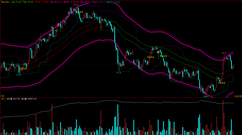 - “平空开多”: 当价格突破20日周期高点时,在K线下方显示“平空开多”,这是强烈的多头启动信号。