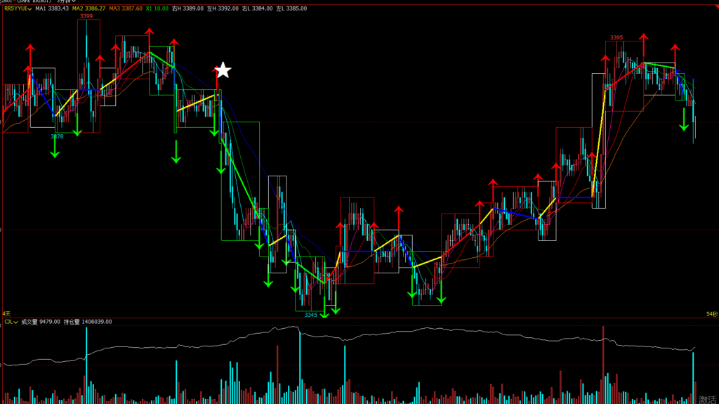 光看均线还不够爽?最暴力的来了!系统会自动根据7日线和15日线的金叉死叉关系,将K线连接成四种颜色的线段,并标记箭头。