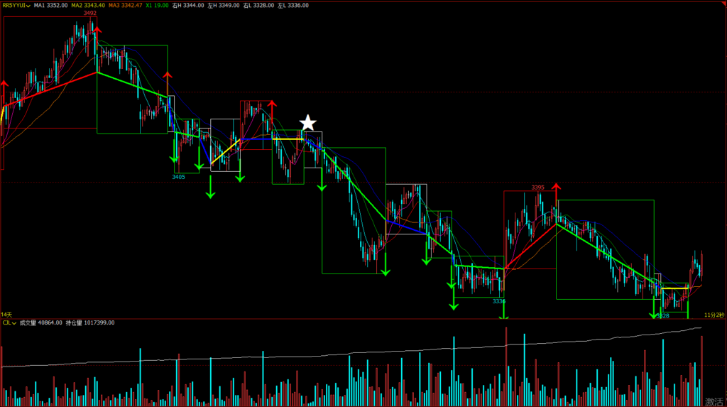 • 绿色箱体: 破位箱体。当前箱体的高点和低点都比前一个箱体更低,这是下跌中继 信号,意味着暴跌还在后头,必须空仓观望!